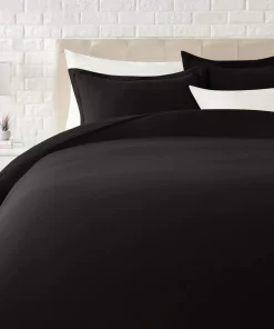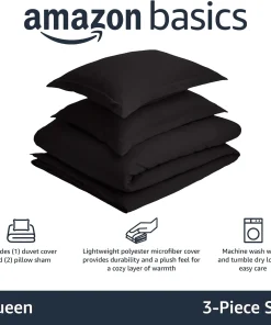 Amazon Basics Lightweight Microfiber 3-Piece Duvet Cover Set with Zipper Closure, Full/Queen, Black, Solid