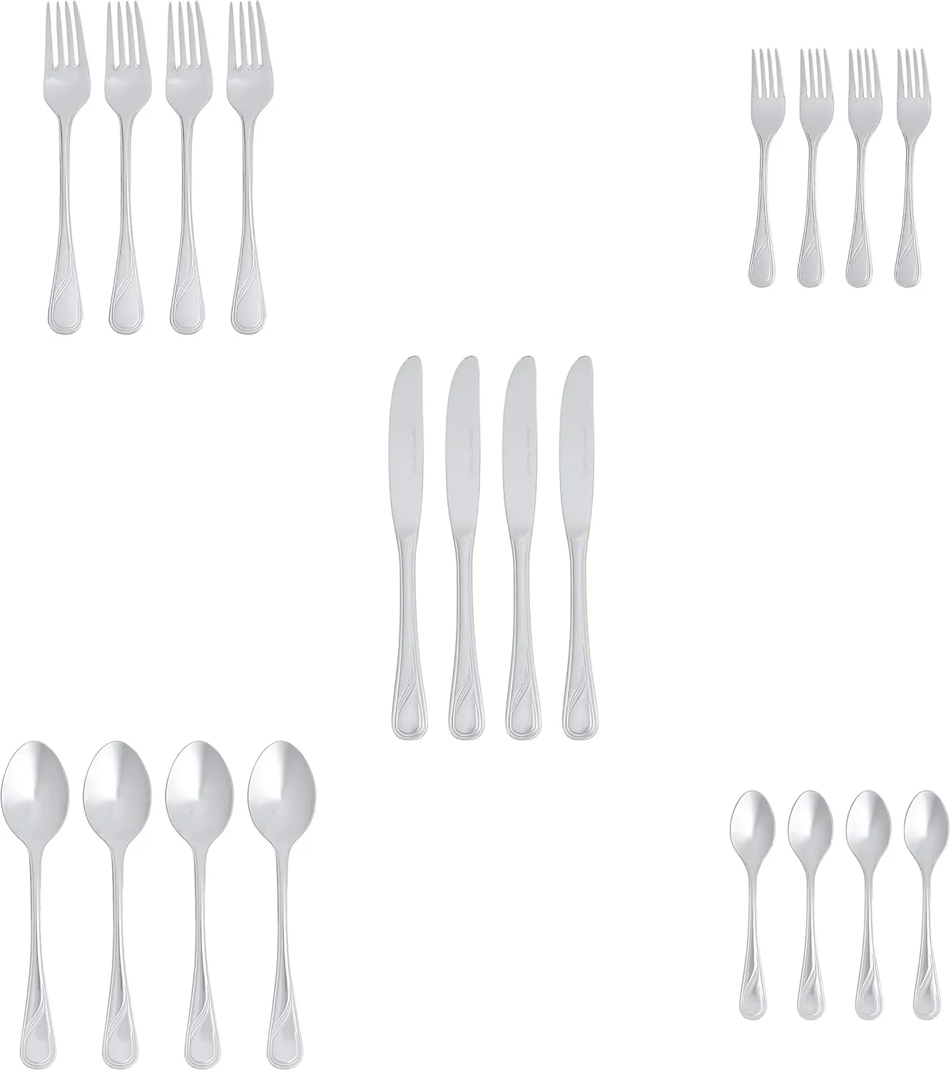 - Includes 4 salad forks, 4 dinner forks, 4 place knives, 4 soup spoons, and 4 teaspoons
