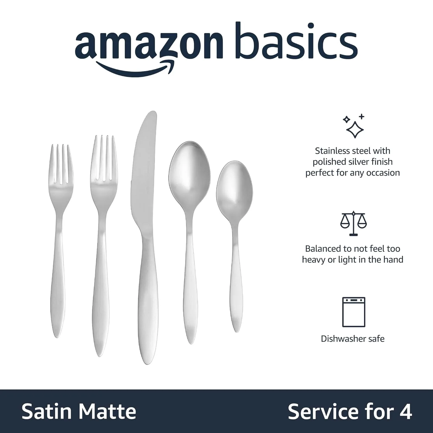 Amazon Basics 20-Piece Stainless Steel Satin Matte Flatware Set, Service for 4