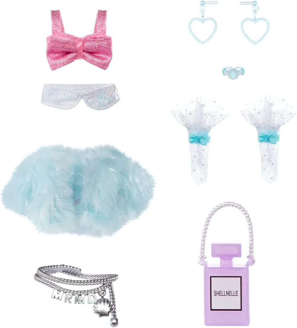 - FASHIONS & ACCESSORIES: Shellnelle is wearing a sparkly pink bow top, faux fur blue jacket with tinsel, fabric collar belt, and mesh cuffs. She accessorizes with heart earrings, a choker necklace, MRMD charm belt, and Shellnelle purse.