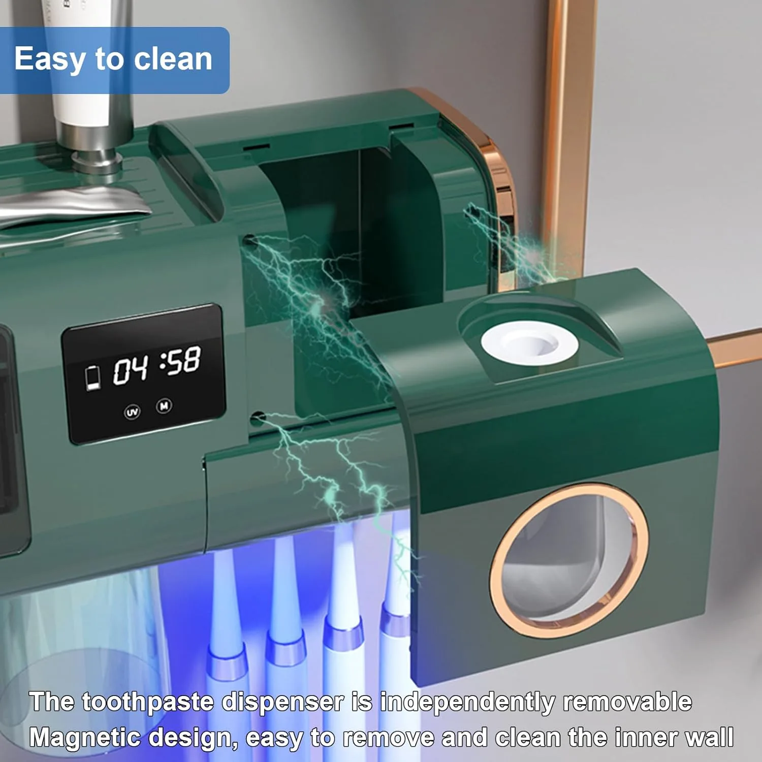 TINS UV Sanitizer Toothbrush for Bathroom, UV Sanitizer Toothbrush Holder, Wall Teeth, Automatic Toothpaste Dispenser, Toothbrush Organizer, USB Charging, 2000 mAh Battery-Green